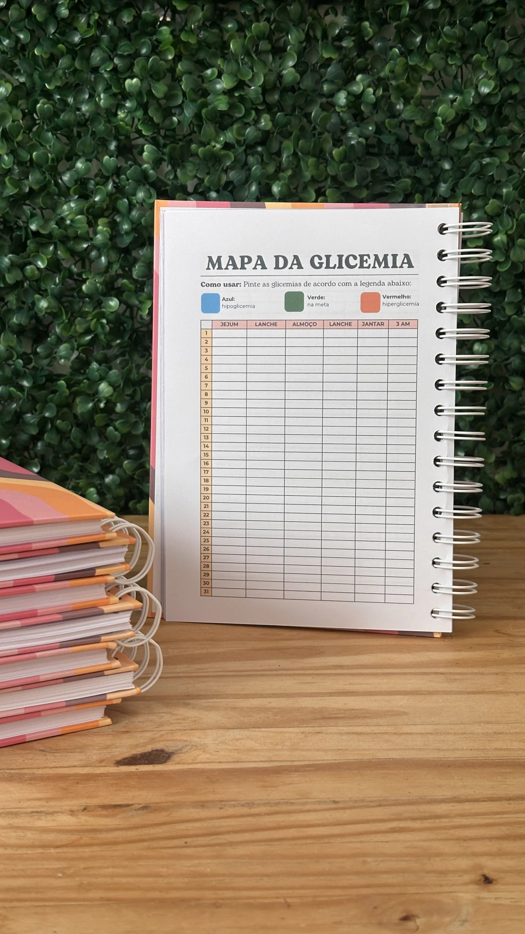 Mais do que uma agenda, ela é uma ferramenta de autocuidado. Com espaço para preencher até 1 ano de registros, você vai poder acompanhar suas glicemias, insulinas, carbos, sintomas, exames e metas de saúde de forma prática e humanizada.
